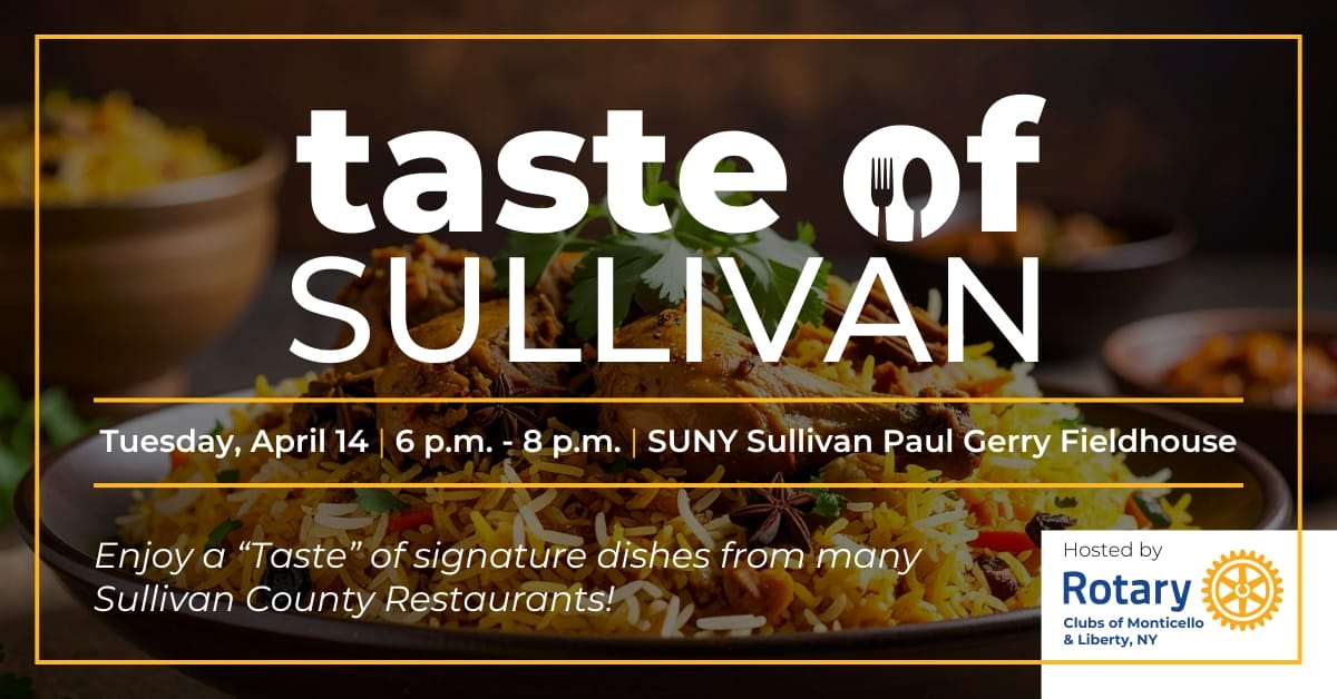 Join the Monticello Rotary Club & Liberty Rotary Club for a “taste” of signature dishes from many Sullivan County restaurants! DATE: Tuesday, April 14, 2026 TIMES: 6 p.m. - 8 p.m. LOCATION: SUNY Sullivan Paul Gerry Fieldhouse COST: $40 per person (cash bar available) The Monticello and Liberty Rotary Clubs invite you to the […]