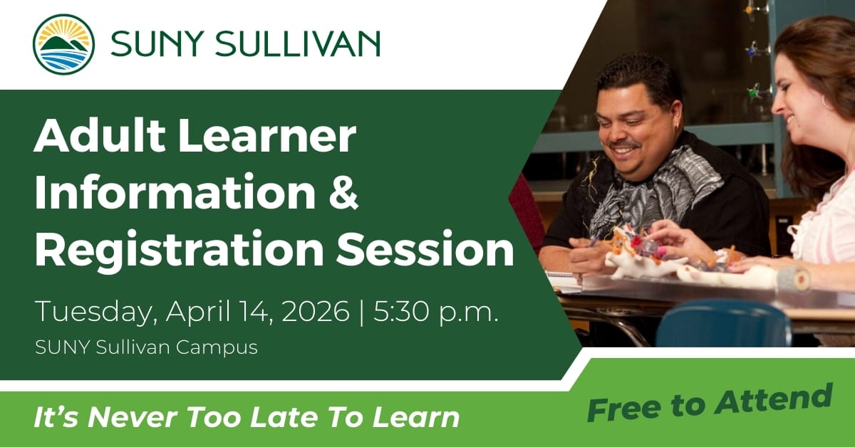 You Have More Options Than You Think. Free Adult Learner Information & Registration Session Tuesday, April 14 | 5:30 – 6:30 p.m. | SUNY Sullivan Campus What you'll learn about: SUNY Reconnect — Free tuition for NY residents ages 25–55 in select programs HSE + College — Earn your high school equivalency while simultaneously […]